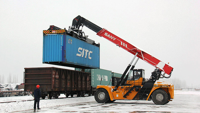 霍爾果斯鐵路貨場中的集裝箱裝車