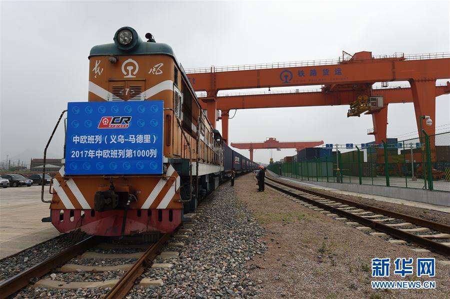 2017年5月13日,2017年第1000列中歐班列從義烏西站駛出。當日,X8024次中歐班列(義烏-馬德里)從浙江義烏鐵路西站鳴笛駛出。這列滿載小商品、服裝等貨物的列車是2017年開行的第1000列中歐班列。中國鐵路總公司統計顯示,2017年中歐班列開行數量較去年同期增加612列,增長158%。